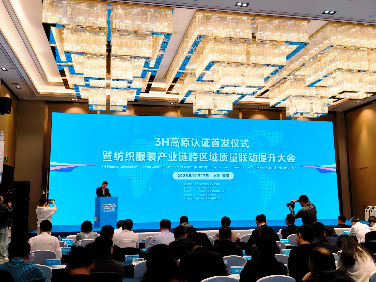 10月17日,由中国消费品质量安全促进会指导、青海省市场监督管理局主办、广州检验检测认证集团有限公司(简称“广检集团”)承办的“3H高原认证首发仪式暨纺织服装产业链跨区域质量联动提升大会”在青海省西宁市举行。来自国家市场监督管理总局认证监管司、国家市场监督管理总局质量发展局、青海省人民政府、青海省各有关委办厅局、青海省市场监督管理局、浙江省市场监督管理局等政府部门的有关领导及近百家产业链龙头企业、科研机构、行业协会代表共同参与盛会。