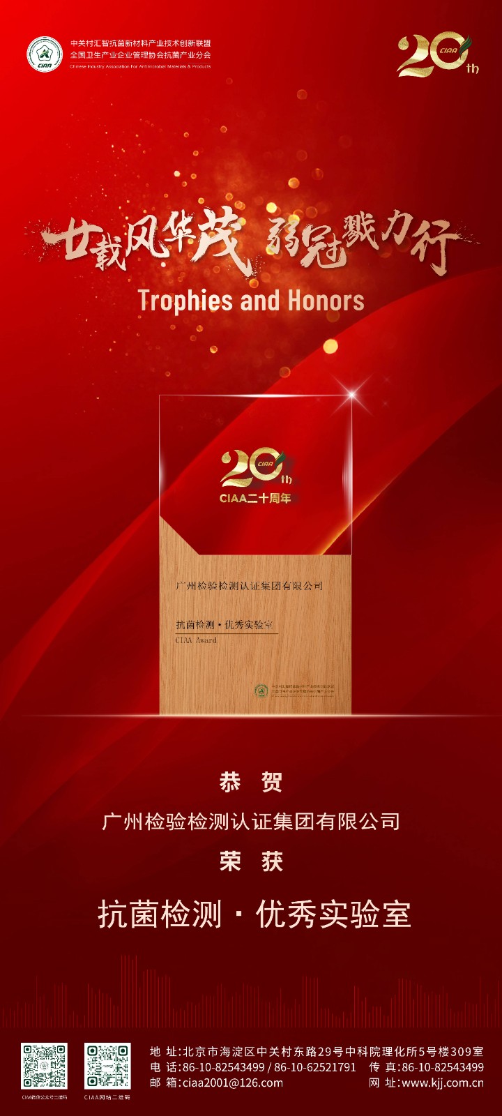 点击分享 近日,CIAA二十周年纪念会在线召开,会议发布了2022年度抗菌检测优秀实验室和合规抗菌检测实验室名单,广检集团名列其中。