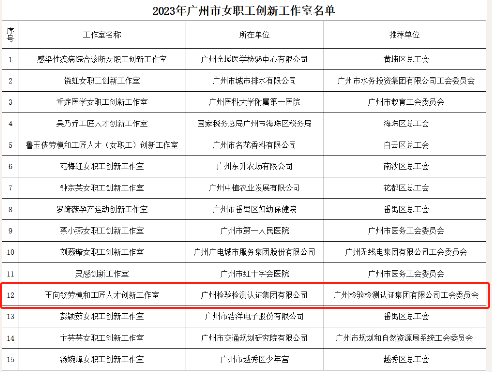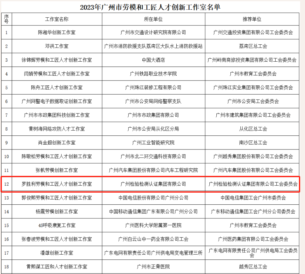 点击分享 为深入推进产业工人队伍建设改革,大力弘扬劳模精神、劳动精神、工匠精神,进一步发挥职工创新工作室示范引领、集智创新、协同攻关的作用。近日,广州市总工会开展了命名2023年市级创新工作室工作,广检集团工会“罗胜利创新工作室”和“王向钦创新工作室”成功分别获评2023年广州市劳模和工匠人才创新工作室、女职工创新工作室。