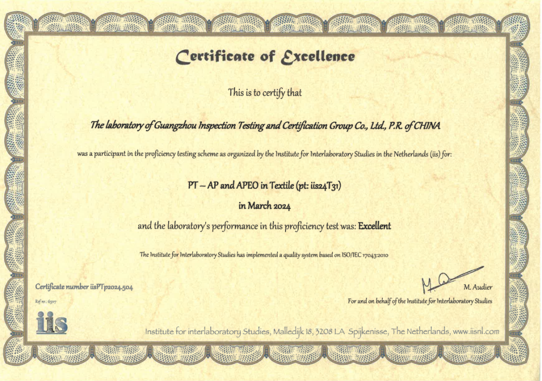 点击分享 近日,广检集团广纺院收到荷兰IIS(Institute for Interlaboratory Studies)颁发的“纺织品烷基酚和烷基酚聚氧乙烯醚(pt:iis24T31”能力验证证书,我院结果满意。