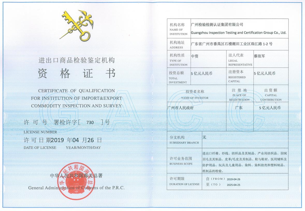 除了是首批海关采信实验室,广检集团早在2019年已经成为了海关总署的进出口商品检验鉴定机构。许可范围包括进出口纤维、纱线、纺织品及其制品,产业用纺织品、羽绒羽毛及其制品、皮革毛皮及其制品、鞋与鞋材、医用辅料及防护用品、玩具及儿童用品、染料、染料助剂和塑料制品、纸制品的检验。