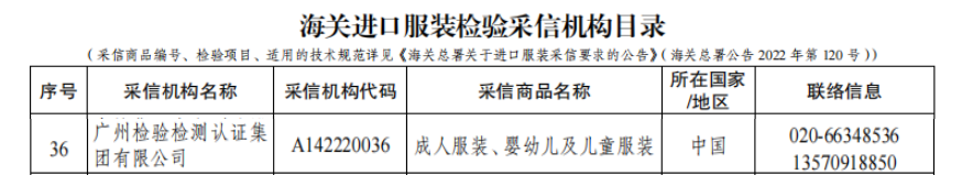 点击分享 2023年5月18日,中华人民共和国海关总署发布海关进口服装检验采信机构目录,广州检验检测认证集团有限公司成为首批进入海关进口服装检验采信机构目录的采信机构。采信机构代码为A142220036, 采信商品名称为:成人服装、婴幼儿及儿童服装。