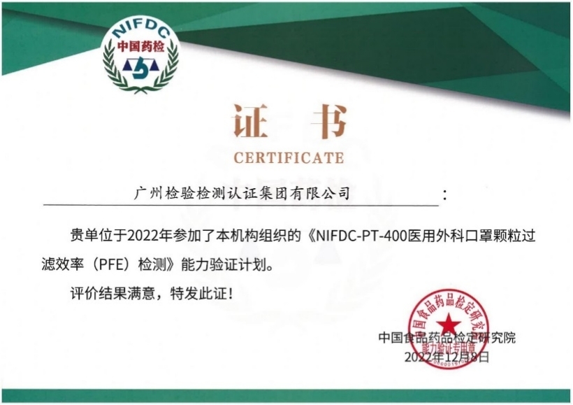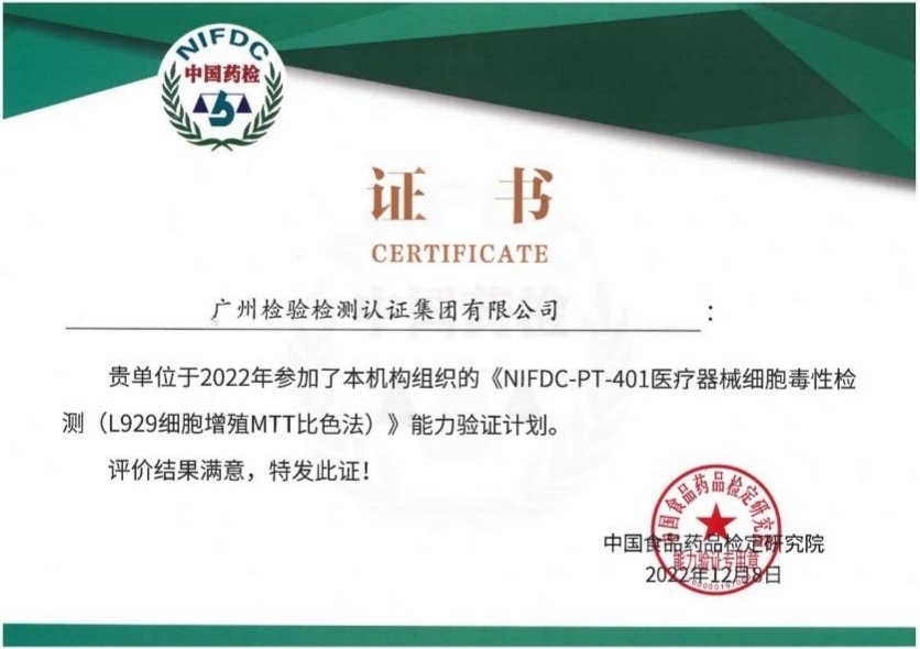 点击分享 近日,广检集团收到国家药品监督管理局组织、中国食品药品检定研究院负责实施的“医疗器械细胞毒性检测(L929细胞增殖MTT比色法)(NIFDC-PT-401)”和“医用外科口罩颗粒过滤效率(PFE)检测(NIFDC-PT-400)”两项能力验证结果报告和证书。